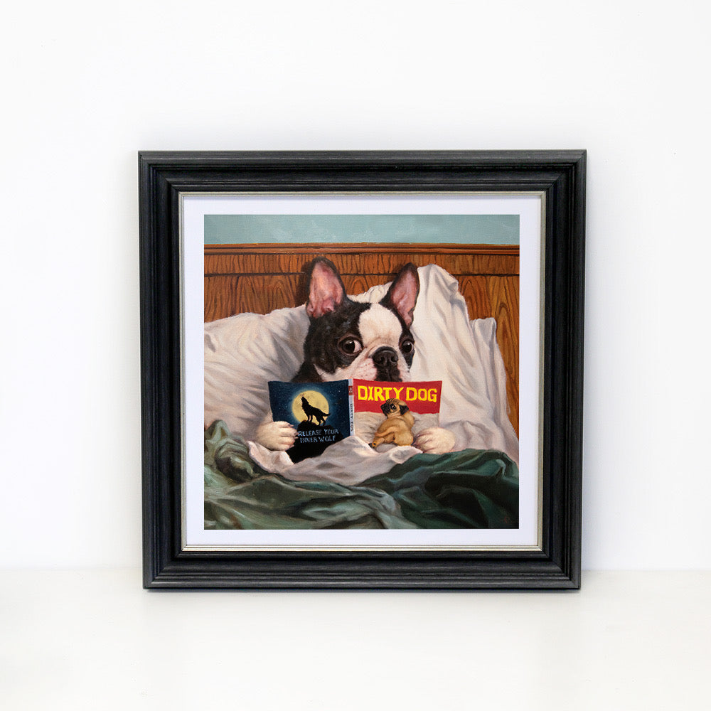 A cheeky Frenchie having a nice read before bed! Tounge-in-cheek gift for those that like a little humour in their life.