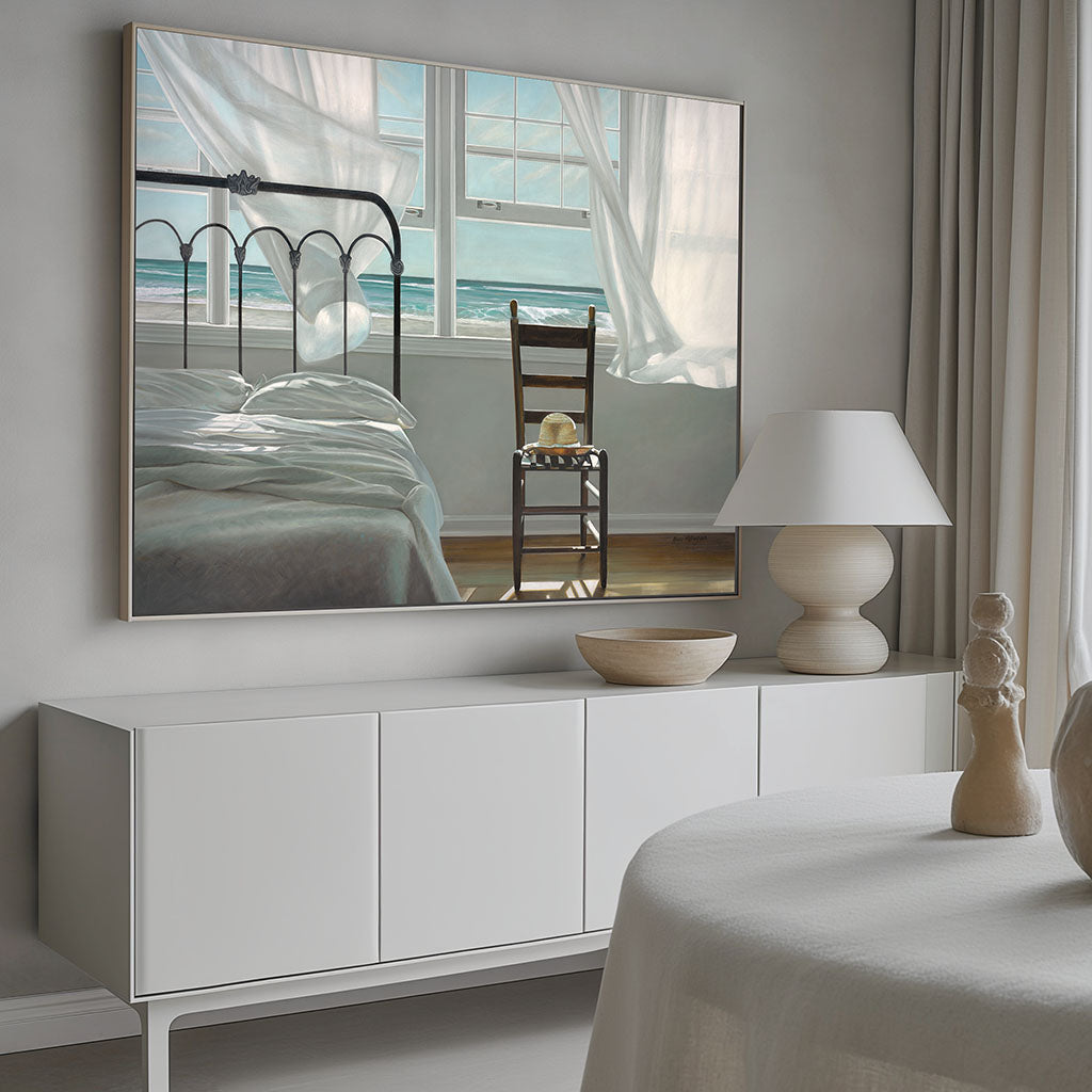 The Dream of Water captures the stillness of a shoreline. Soft waves meet sand in a quiet rhythm, blurring the edge between sea and sky. The colours are soft — hazy blues, pale aquas, a touch of white—evoking the calm of a dream not yet fully remembered. There are no people, only presence: wind, tide, light. It is a moment suspended, where the ocean breathes and the world forgets to speak.