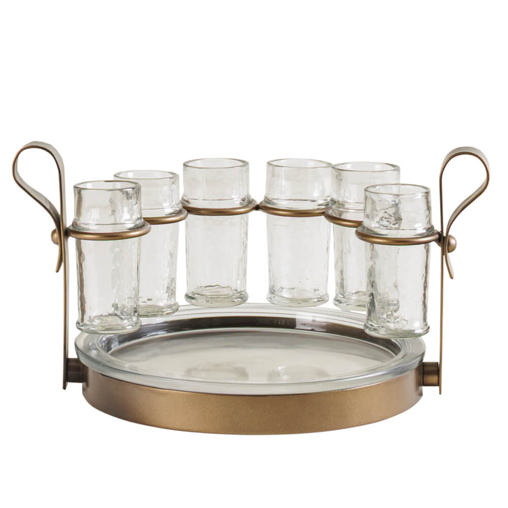 Elevate your tequila experience with the wonderful Tequila Set. Featuring hammered clear glass shot glasses nestled in a smoke-gold iron frame, this set includes a round tray ideal for slicing lemons. Elegant handles add style and ease for serving, while the warm gold finish brings a touch of luxury to any gathering. Perfect for entertaining or as a standout bar accessory.
